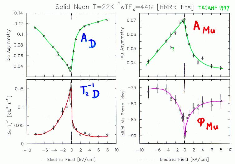E-dep of Dia and Mu signals in solid Neon at 22K and 44G [1997]
