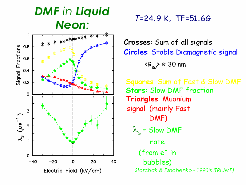 In liquid neon, free electrons tend to form bubbles, after which their motion is so slow that DMF from such localized electrons is manifest only in an otherwise inexplicable relaxation rate of the diamagnetic precession signal; this is referred to as “slow DMF”. Electrons which remain delocalized long enough to reach the muon in time to contribute to the Mu precession signal constitute “fast DMF”. Both types of electrons are pulled away from the muon by an applied electric field E, incleasing the diamagnetic fraction at the expense of the DMF fraction. Again only the nearby electrons contribute for high E fields, and these reach the muon sooner, giving a higher λS.